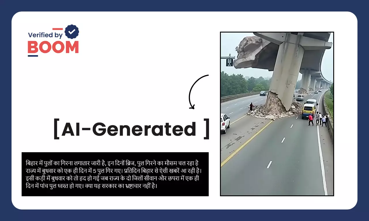 सोशल मीडिया पर एक वीडियो वायरल हो रहा है जिसके साथ दावा किया जा रहा है कि यह बिहार में पुल गिरने की घटना का वीडियो है. बूम ने जांच की तो पाया कि यह एक एआई जनरेटेड वीडियो है.