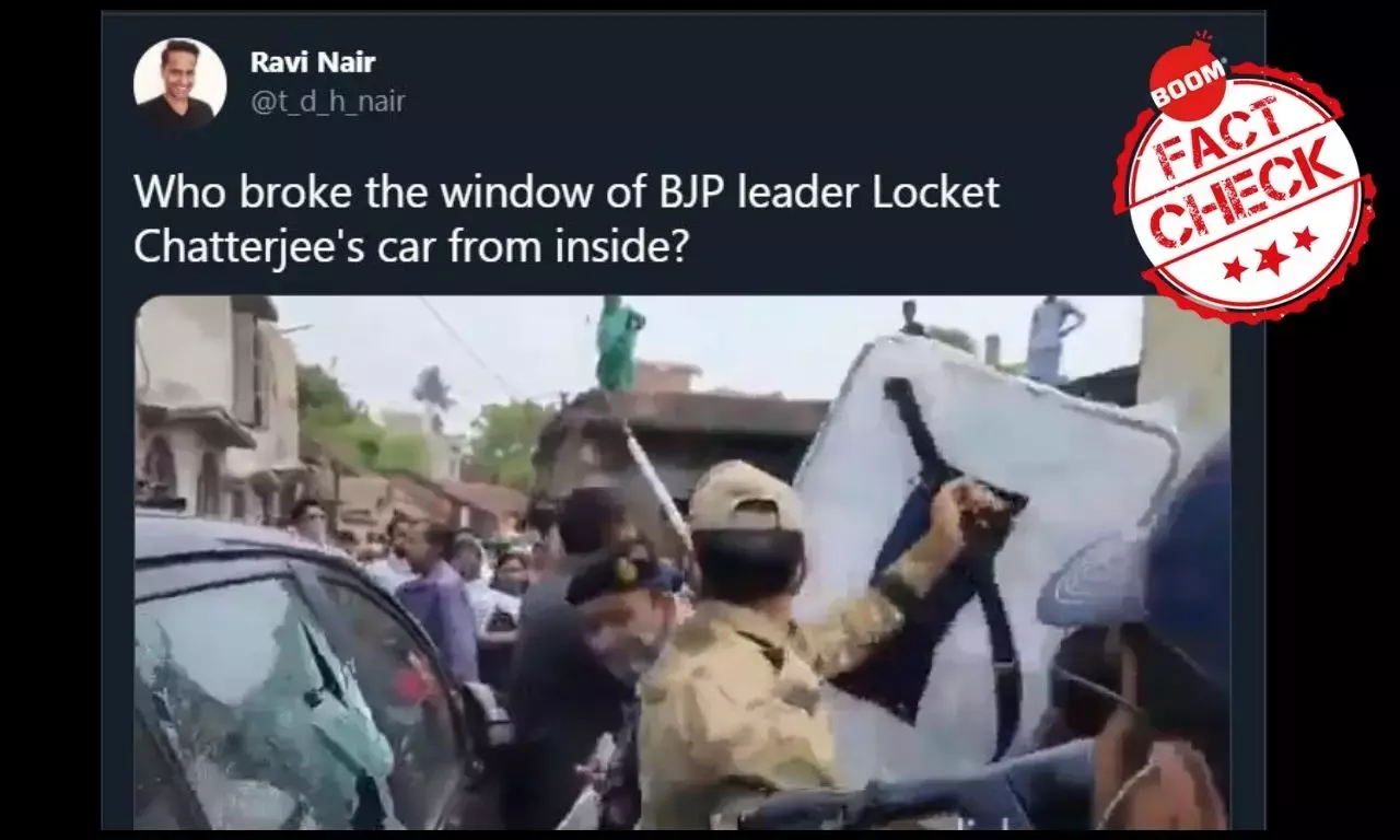 बूम ने पाया कि एक पत्थर बीजेपी सांसद लॉकेट चटर्जी की कार के शीशे पर आकर पड़ा था जिससे खिड़की का कांच टूट गया.