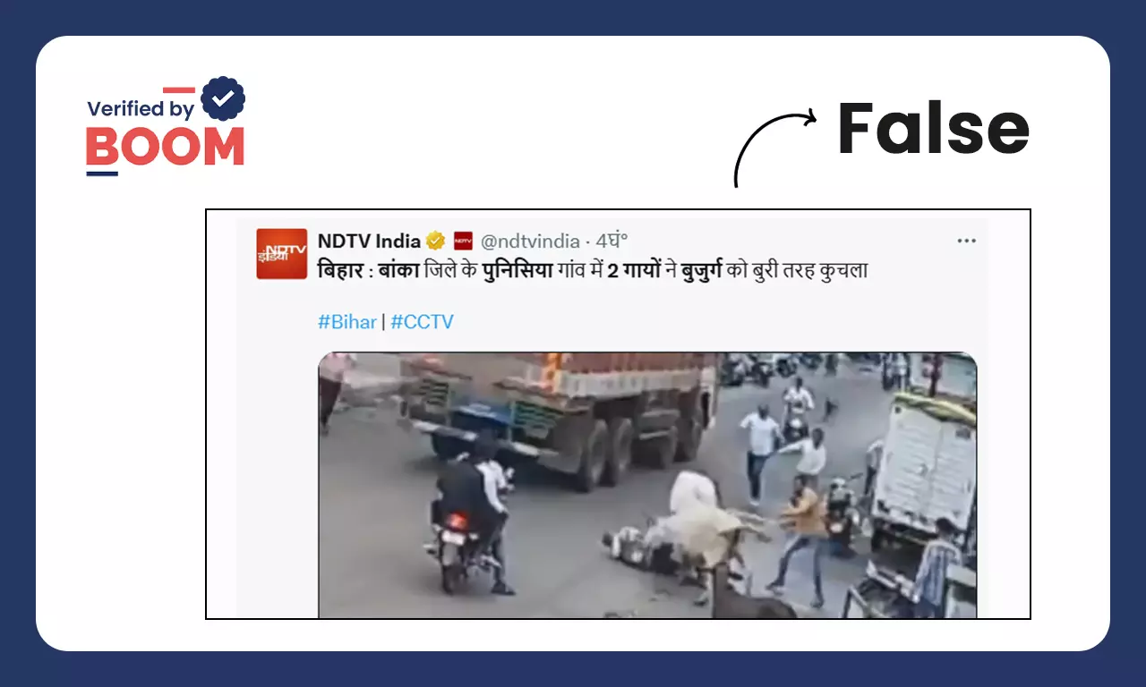 मीडिया आउटलेट एनडीटीवी ने इस वीडियो को शेयर करते हुए जानकारी दी कि बिहार के बांका जिले में दो गायों ने एक बुजुर्ग पर हमला कर दिया. गाय के हमले से बुजुर्ग की हालत नाजुक है. फेसबुक और एक्स पर कई यूजर ने भी इसी जानकारी के साथ इस वीडियो को शेयर किया है.