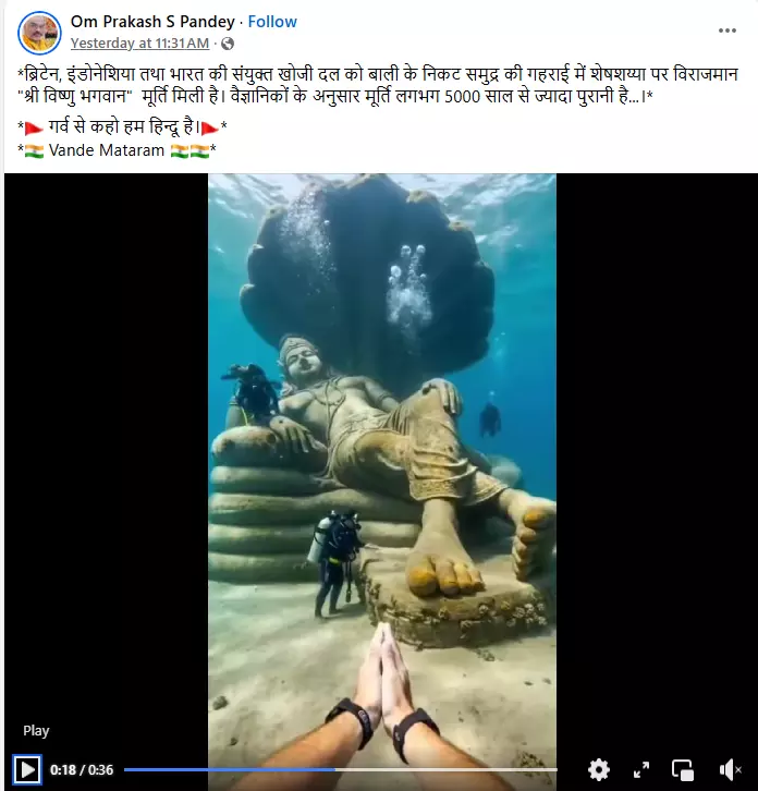 एक फेसबुक यूजर ने वीडियो को शेयर करते हुए लिखा है, 'ब्रिटेन, इंडोनेशिया तथा भारत के संयुक्त खोजी दल को बाली के निकट समुद्र की गहराई में शेषशैय्या पर विराजमान श्री विष्णु भगवान की मूर्ति मिली है. वैज्ञानिकों के अनुसार यह मूर्ति लगभग 5,000 साल से ज्यादा पुरानी है..."