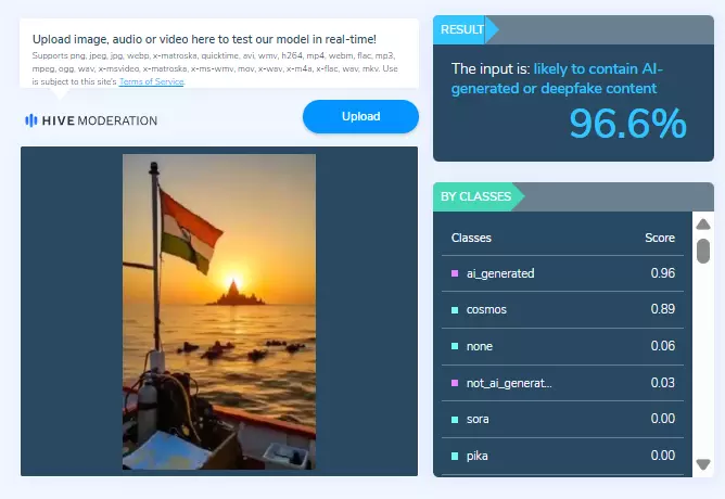हमने वायरल वीडियो के स्क्रीनशॉट एवं वीडियो के अलग-अलग हिस्सों को एआई डिटेक्शन टूल Hive Moderation पर भी चेक किया. टूल ने वीडियो के एआई जनरेटेड होने की प्रबल संभावना बताई है.