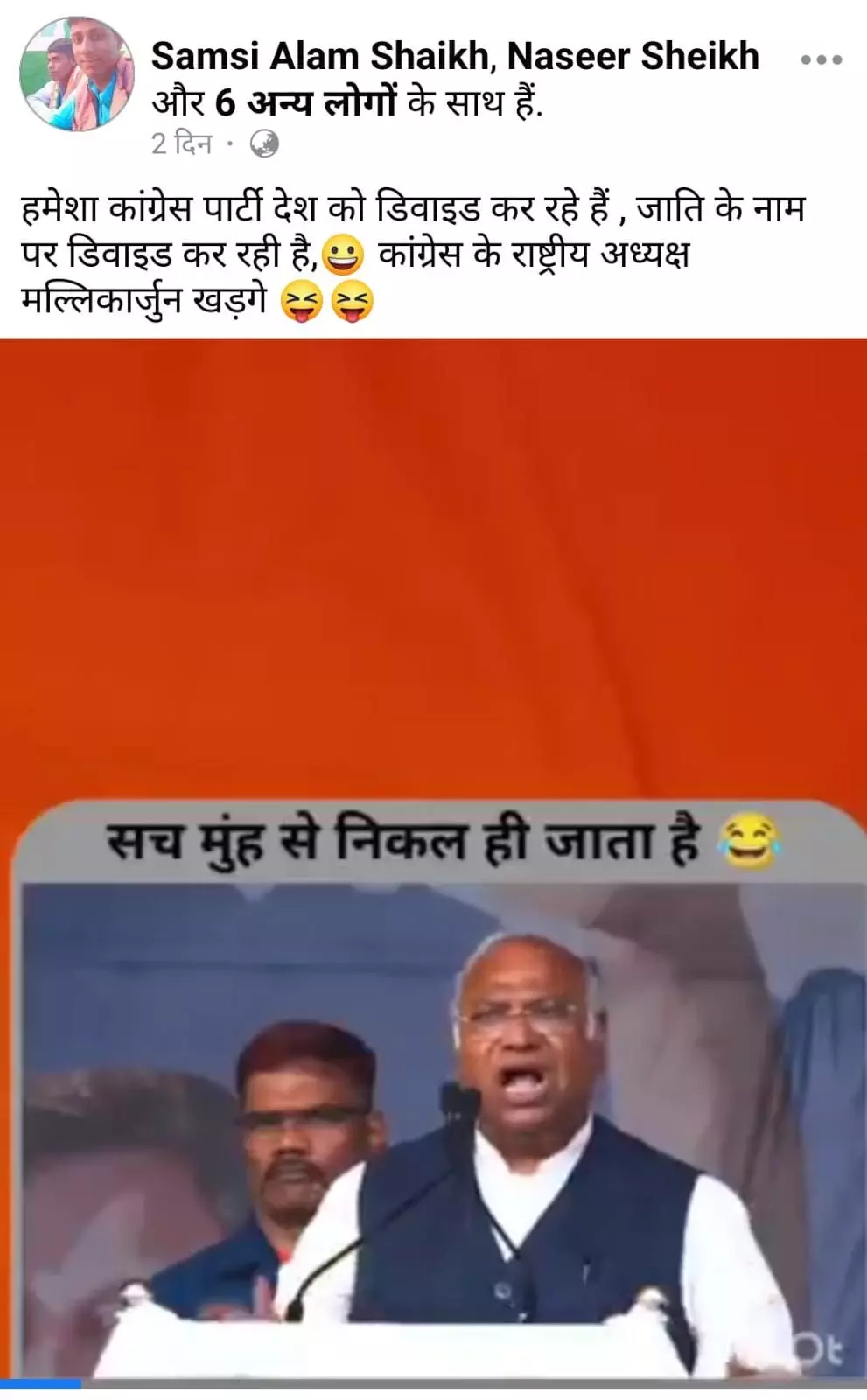 सोशल मीडिया पर कांग्रेस के राष्ट्रीय अध्यक्ष मल्लिकार्जुन खरगे का एक वीडियो वायरल है, जिसमें वह कथित तौर पर कांग्रेस को देश बांटने वाली पार्टी कहते नजर आ रहे हैं.