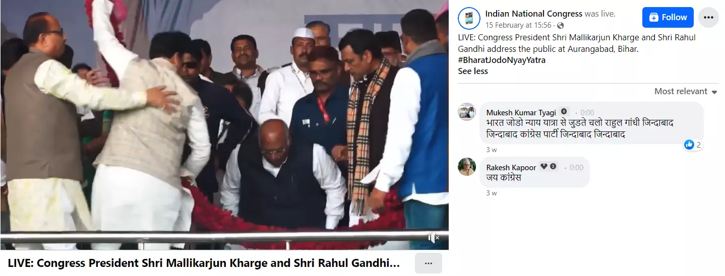 कांग्रेस के आधिकारिक फेसबुक पेज पर भी इस वीडियो का लाइव वर्जन देखा जा सकता हैं. 15 फरवरी को किए गए इस पोस्ट के अनुसार, कांग्रेस अध्यक्ष मल्लिकार्जुन खरगे और राहुल गांधी ने बिहार के औरंगाबाद में 'भारत जोड़ो न्याय यात्रा' के तहत जनता को संबोधित किया था. इसी दौरान उनके दिए गए भाषण की क्रॉप्ड लाइन वायरल है.