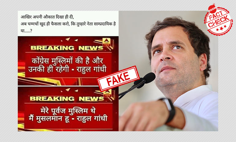 फ़ेसबुक पर एक पोस्ट काफ़ी वायरल हो रहा है | इस पोस्ट में ए.बी.पी. न्यूज़ के टेम्पलेट के स्क्रीनशॉट्स में राहुल गाँधी के दो कथित बयानों को शेयर करते हुए उन्हें सांप्रदायिक कोण दिया गया है | बूम ने अपनी पड़ताल में पता लगाया की ये पोस्ट्स पहले भी वायरल हो चुके हैं | जबकि एक बयान को खुद ए.बी.पी. न्यूज़ खारिज कर चूका है, दूसरे बयान को लेकर भी काफ़ी अटकलें हैं और उसकी सत्यता का कोई कोई ठोस प्रमाण नहीं है |