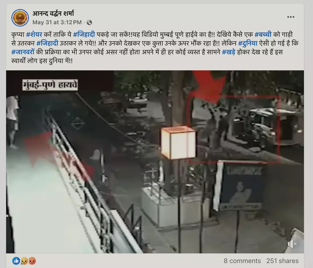 फेसबुक पर एक यूजर ने इस घटना के वीडियो को शेयर करते हुए लिखा, 'यह विडियो मुम्बई पुणे हाईवे का है. देखिये कैसे एक बच्ची को गाड़ी से उतरकर जिहादी उठाकर ले गये और उनको देखकर एक कुत्ता उनके ऊपर भौंक रहा है लेकिन दुनिया ऐसी हो गई है कि जानवरों की प्रक्रिया का भी उनपर कोई असर नहीं होता अपने में ही हर कोई व्यस्त है. सामने खड़े होकर देख रहे हैं इस स्वार्थी लोग इस दुनिया में.'
