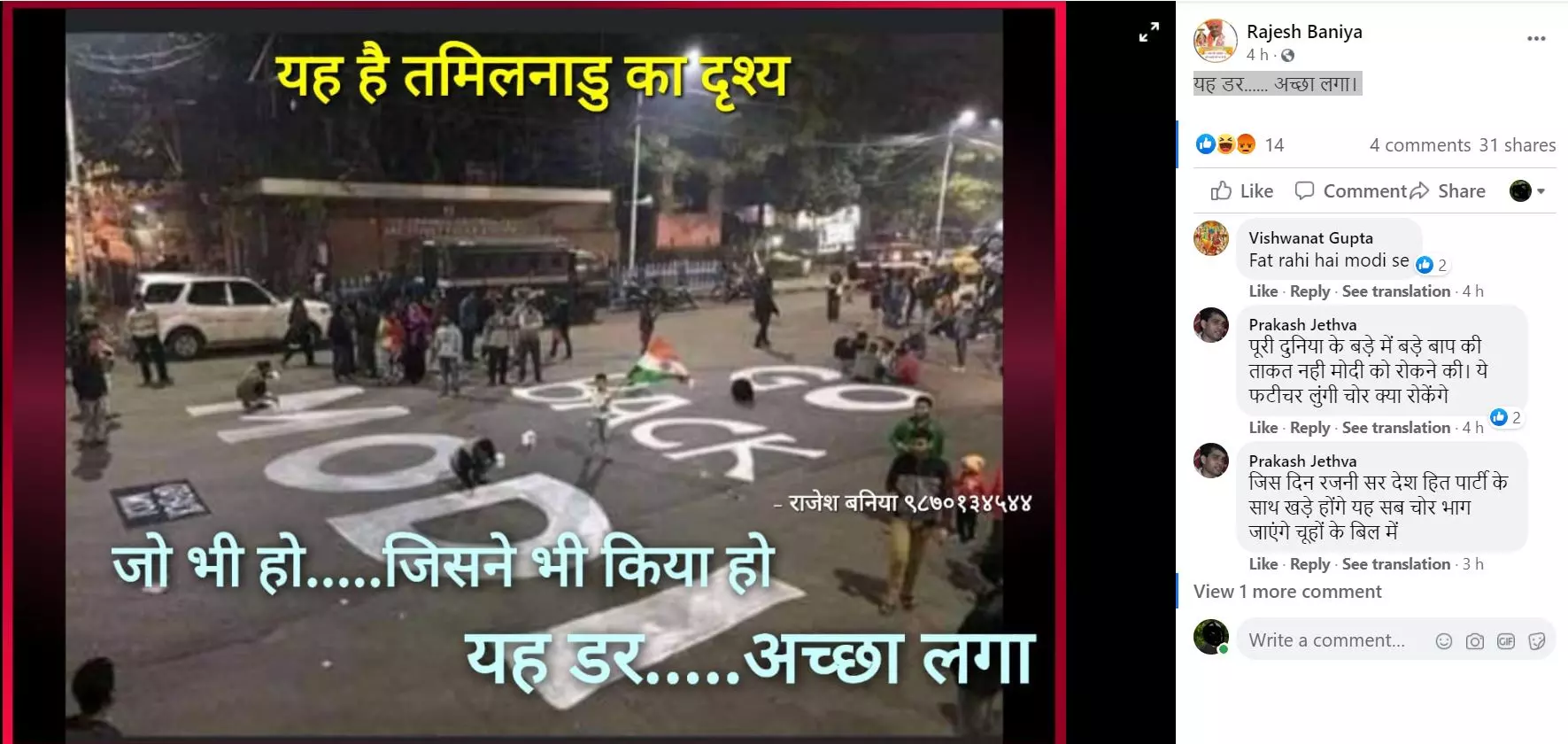 तस्वीर के ऊपर लिखा है: "यह है तमिलनाडु का दृश्य," आगे इसी तस्वीर पर लिखा है, "जो भी हो... जिसने भी किया हो... यह डर अच्छा लगा." एक पोस्ट में कैप्शन में लिखा है: "आज #तमिलनाडु की तस्वीर ऐसा पहले कभी किसी के साथ हुआ हो तो बताए ? #GO_BACK_MODI"