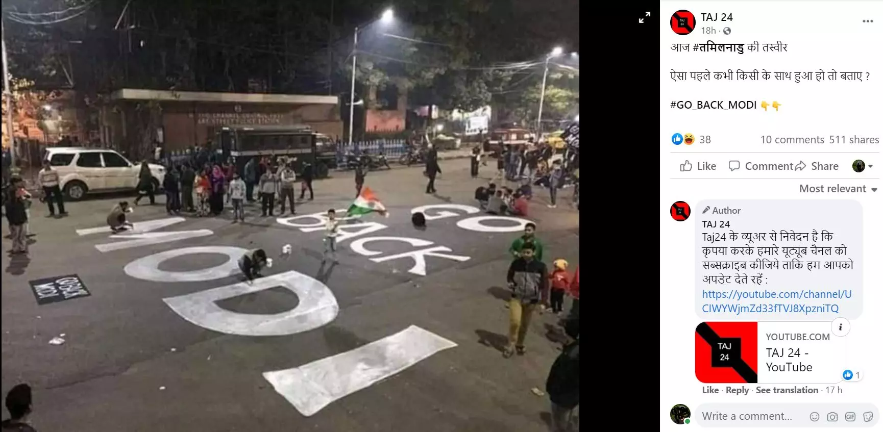 रोड पर 'गो बैक मोदी' का नारा दिखाती यह फ़ोटो तमिलनाडु की नहीं है