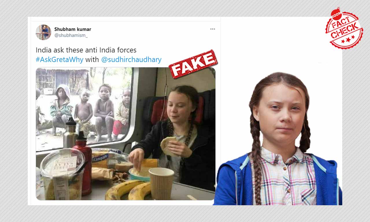 ट्विटर पर पर्यावरण कार्यकर्ता ग्रेटा थन्बर्ग की एक फ़ोटोशॉप्ड तस्वीर वायरल हो रही है. नेटिज़ेंस यह बता कर रहे हैं कि ट्रेन के बाहर गरीब बैठे हैं और ग्रेटा ट्रेन के अंदर लंच कर रही हैं. यह तस्वीर फ़र्ज़ी है.