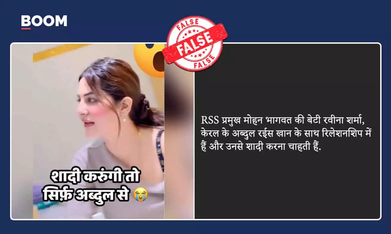 एक महिला की तस्वीर सोशल मीडिया पर इस दावे से वायरल है कि वह राष्ट्रीय स्वयंसेवक संघ प्रमुख मोहन भागवत की बेटी रवीना शर्मा हैं. इसके अलावा वह केरल के अब्दुल रईस खान के साथ रिलेशनशिप में हैं और उससे शादी करना चाहती हैं.