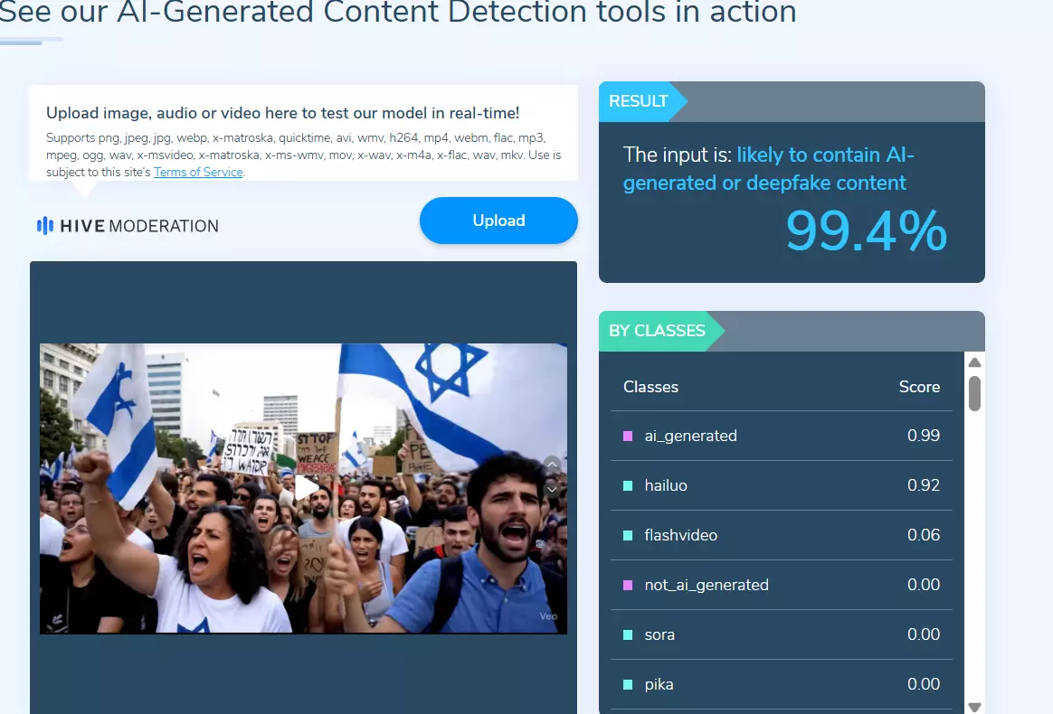 इसके बाद हमने वीडियो को एआई डिटेक्टर टूल HIVE Moderation पर चेक किया, जिसने वीडियो के आर्टिफिशियल इंटेलिजेंस तकनीक से बने होने की संभावना 93 फीसदी तक बताई. वहीं वीडियो के कीफ्रेम की जांच करने पर 99 फीसदी AI जनरेटेड बताया.