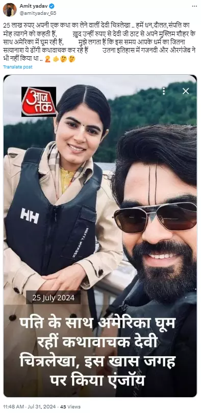 एक्स पर इसे को शेयर करते हुए एक वेरिफाइड यूजर ने लिखा, '25 लाख रुपए अपनी एक कथा का लेने वाली देवी चित्रलेखा .. हमें धन, दौलत, संपत्ति का मोह त्यागने को कहती हैं, खुद उन्हीं रुपए से देवी जी ठाट से अपने मुस्लिम शौहर के साथ अमेरिका में घूम रही हैं...'