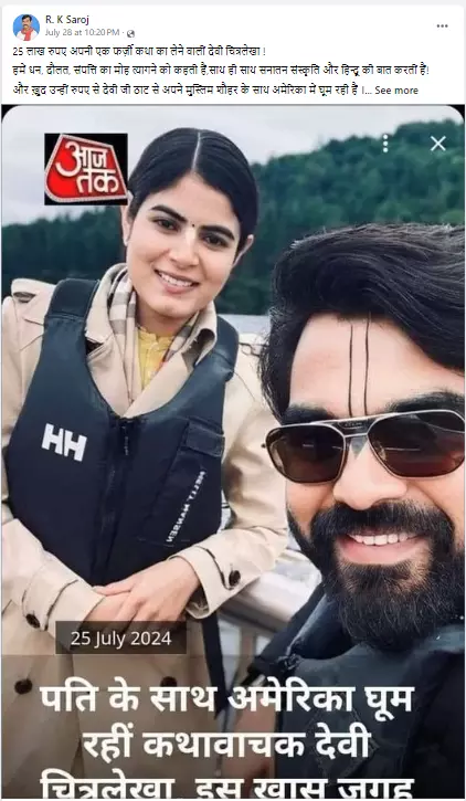 वायरल तस्वीर पर न्यूज वेबसाइट आजतक का लोगो और तारीख (25 जुलाई 2024) मौजूद है. साथ ही उसपर लिखा है, 'पति के साथ अमेरिका घूम रहीं कथावाचक देवी चित्रलेखा..'
