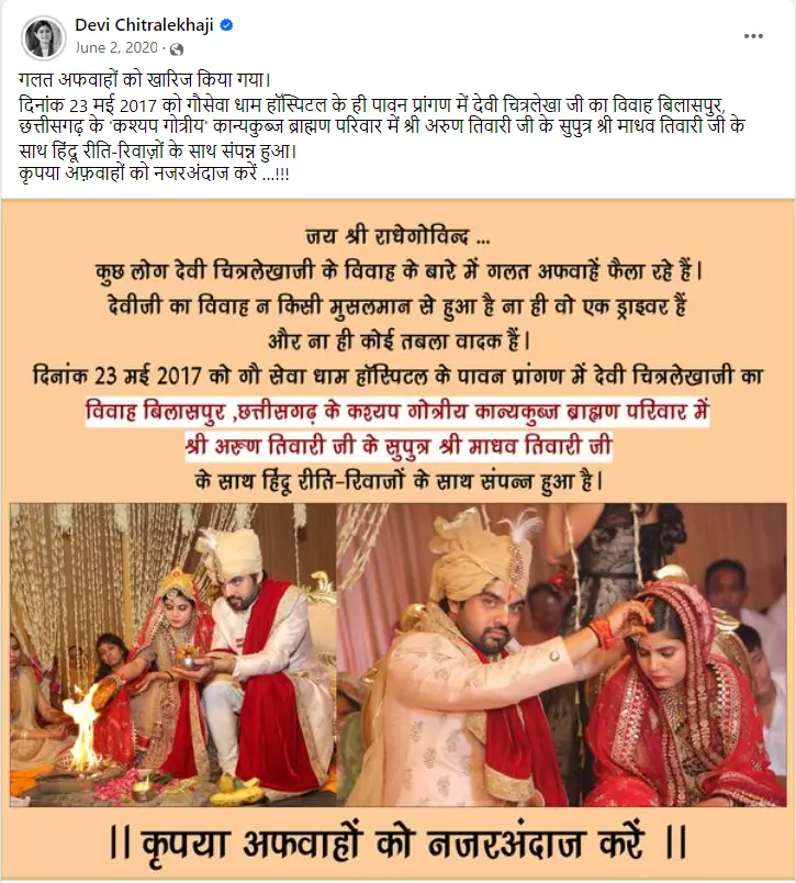 इस संदर्भ में चित्रलेखा का 2 जून 2020 को किया गया एक फेसबुक पोस्ट भी देखा जा सकता है. इस पोस्ट में उन्होंने इस तरह की गलत अफवाहों को खारिज करते हुए बताया था कि उनका विवाह 23 मई 2017 को छत्तीसगढ़ के ‘कश्यप गोत्रीय’ कान्यकुब्ज ब्राह्मण परिवार में अरुण तिवारी के सुपुत्र माधव तिवारी के साथ हिंदू रीति-रिवाजों से हुआ था.
