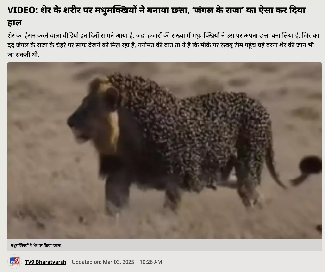 टीवी9 भारतवर्ष ने अपनी खबर के हैडिंग और स्ट्रैप में बताया कि शेर के शरीर पर हजारों की संख्या में मधुमक्खियों ने अपना छत्ता बना लिया, जिसके बाद रेस्क्यू टीम ने पहुंचकर शेर की जान बचाई.
