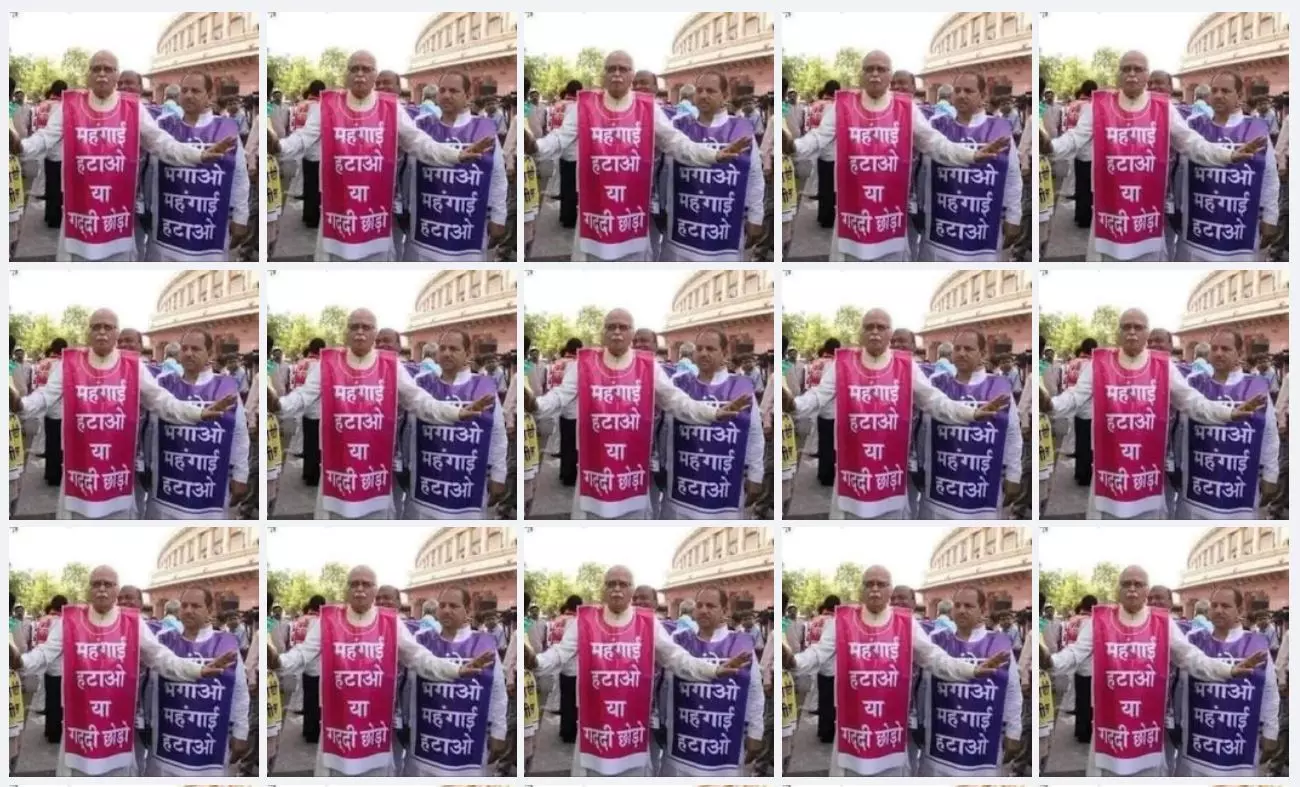 इसी बीच एक तस्वीर वायरल हो रही है जिसमें लाल कृष्ण अडवाणी ने गुलाबी रंग का शर्ट नुमा बोर्ड पहना हुआ है जिसपर, 'महंगाई हटाओ या गद्दी छोड़ो' लिखा है.