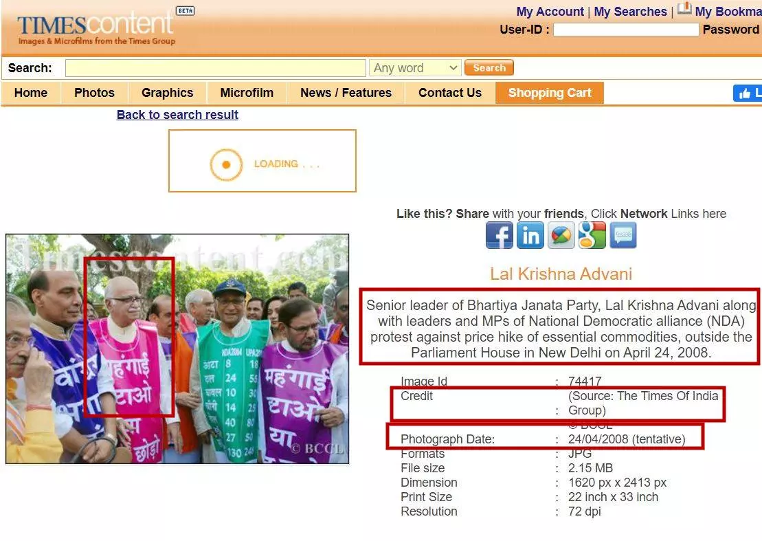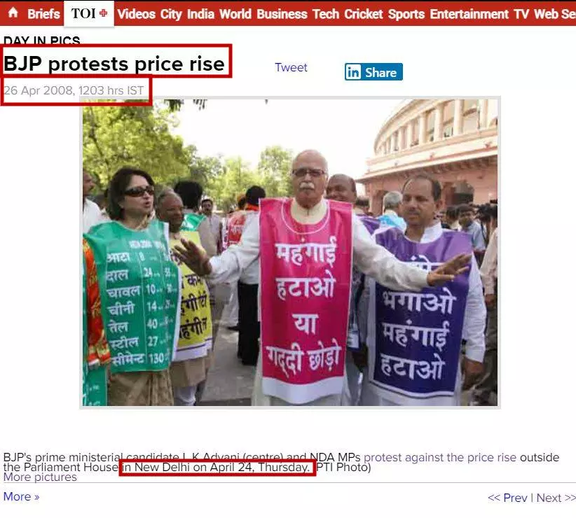 इस तस्वीर के कैप्शन में लिखा था: "एन.डी.ए के सांसदों के साथ भाजपा के प्रधानमंत्री पद के उम्मीदवार एल.के अडवाणी 24 अप्रैल को नई दिल्ली में पार्लियामेंट हाउस पर महंगाई के ख़िलाफ़ प्रदर्शन कर रहे हैं. (PTI Photo)"
