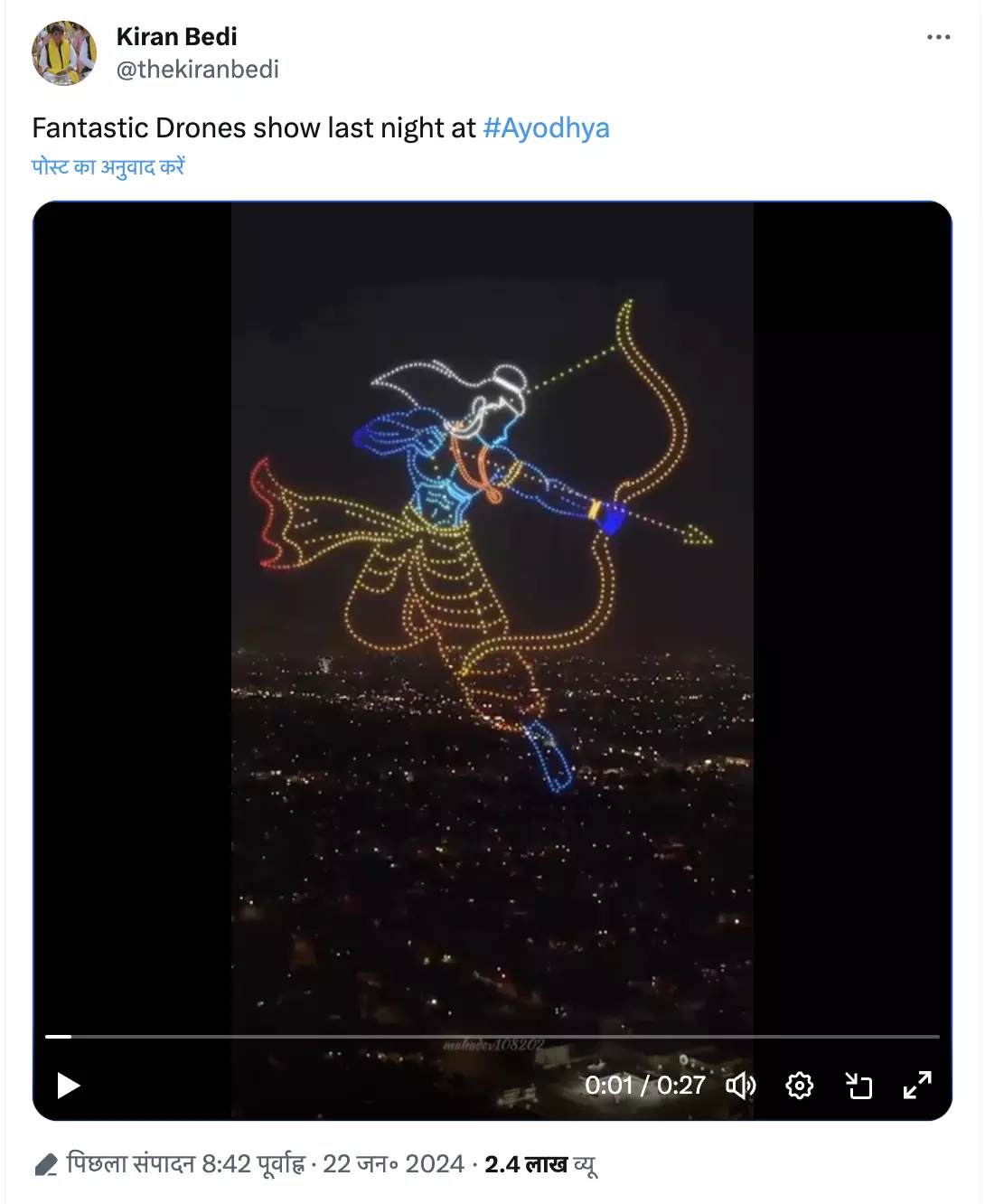 भाजपा नेता और पुडुचेरी की पूर्व उपराज्यपाल किरण बेदी ने अपने एक्स अंकाउट पर वीडियो पोस्ट करते हुए लिखा, "कल रात अयोध्या में शानदार ड्रोन शो"