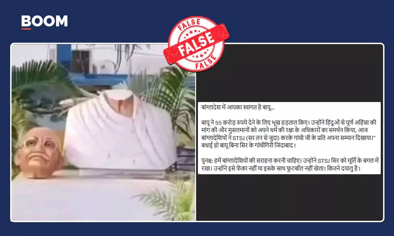 भारत और बांग्लादेश के बीच जारी तनाव के मद्देनजर बांग्लादेश में महात्मा गांधी की प्रतिमा तोड़ने के दावे से सोशल मीडिया पर एक तस्वीर वायरल हो रही है. बूम ने फैक्ट चेक में पाया कि वायरल तस्वीर के साथ किया जा रहा दावा गलत है.