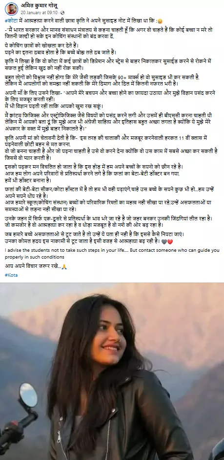 सोशल मीडिया प्लेटफॉर्म पर यूजर्स वायरल फोटो और सुइसाइड नोट के साथ कृति नाम की छात्रा द्वारा आत्महत्या करने के मामले को शेयर कर रहे हैं.