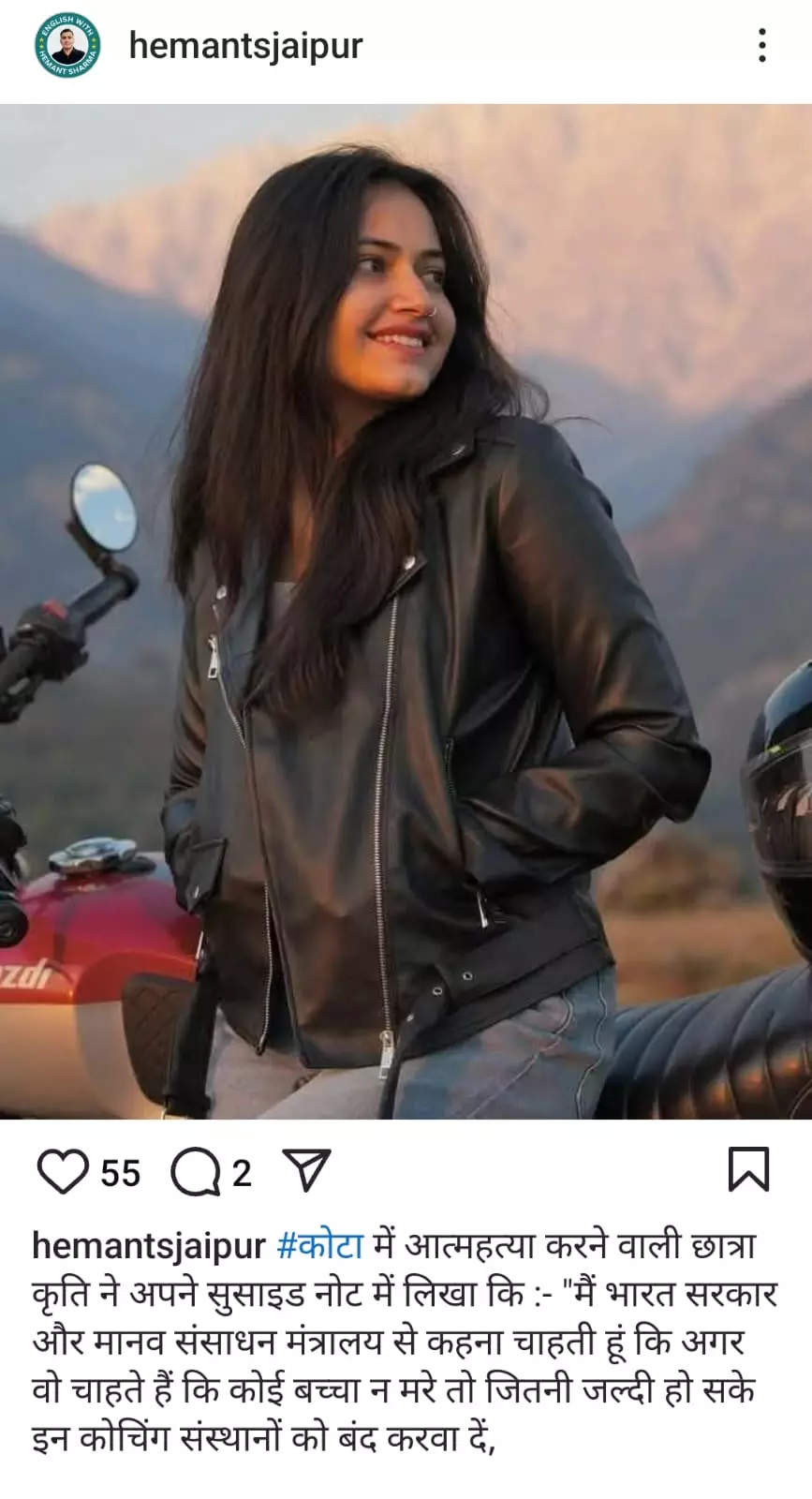 सोशल मीडिया पर एक युवती की तस्वीर के साथ सुइसाइड नोट वायरल है, जिसे लेकर दावा किया जा रहा है कि राजस्थान के कोटा में कृति नाम की एक छात्रा ने आत्महत्या कर ली. इसके साथ छात्रा ने सुइसाइड नोट में सरकार से देश में संचालित कोचिंग संस्थानों को बंद करवाने की अपील की है.