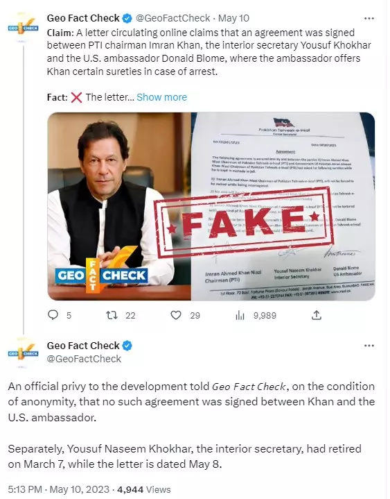 हालांकि बूम ने अपनी जांच में पाया कि वायरल लेटर हेड फ़र्ज़ी है और गिरफ़्तारी से पहले पाकिस्तान सरकार एवं इमरान खान के बीच ऐसा कोई करार नहीं हुआ था.