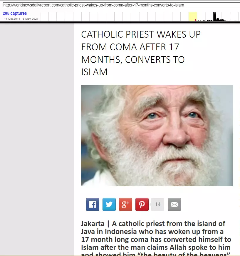 रिपोर्ट में आगे लिखा है कि मूल लेख वर्ल्ड न्यूज़ डेली रिपोर्ट (WNDR) - जो कि एक व्यंग्य वेबसाइट है - द्वारा प्रकाशित किया गया था जिसमें दावा किया गया कि 87 वर्षीय एडुआर्डो विन्सेन्ज़ो मारिया गोमेज़ नामक स्पेन के एक कैथोलिक पादरी ने 17 महीने के कोमा के बाद धर्म बदल लिया. यह पादरी पिछले 43 सालों से इंडोनेशिया के जावा द्वीप पर निवास कर रहा था.