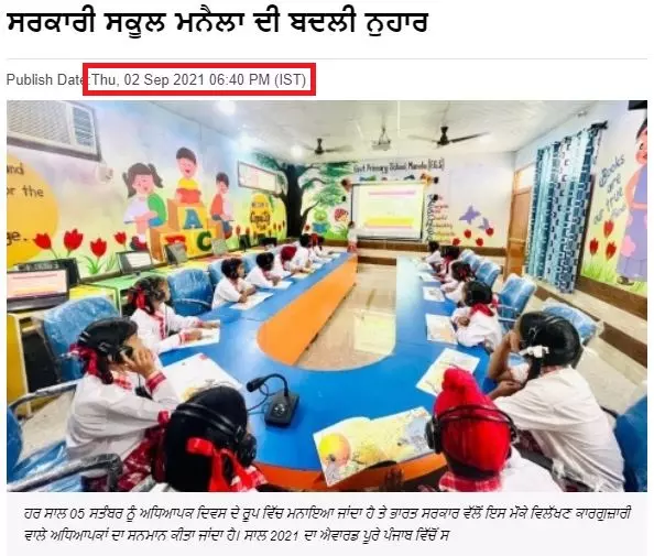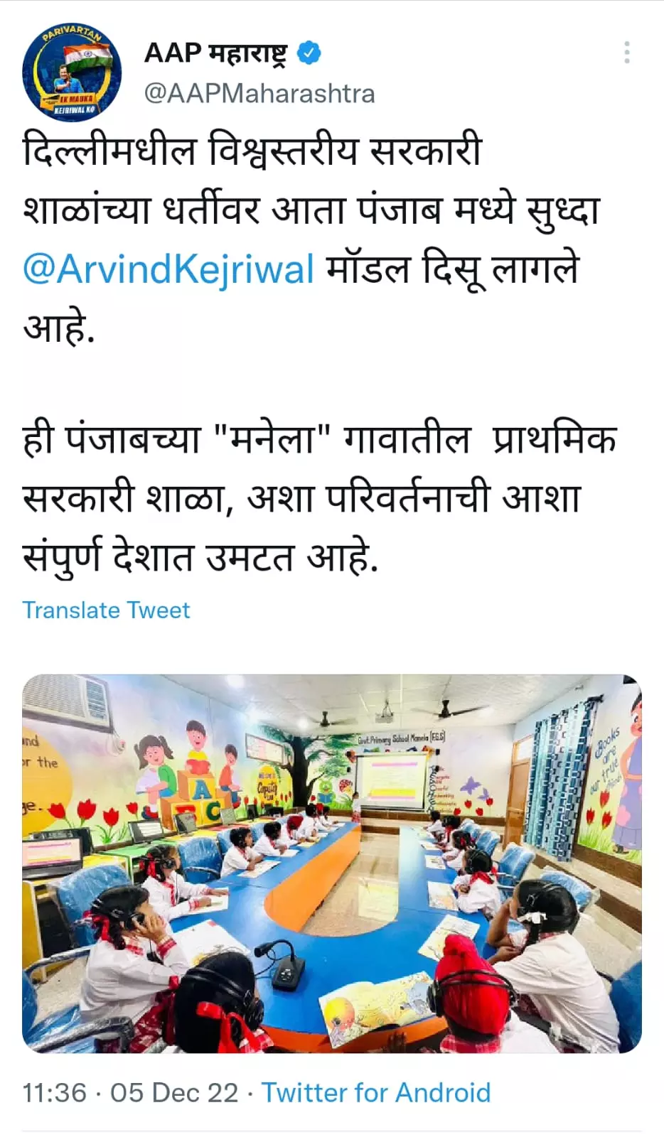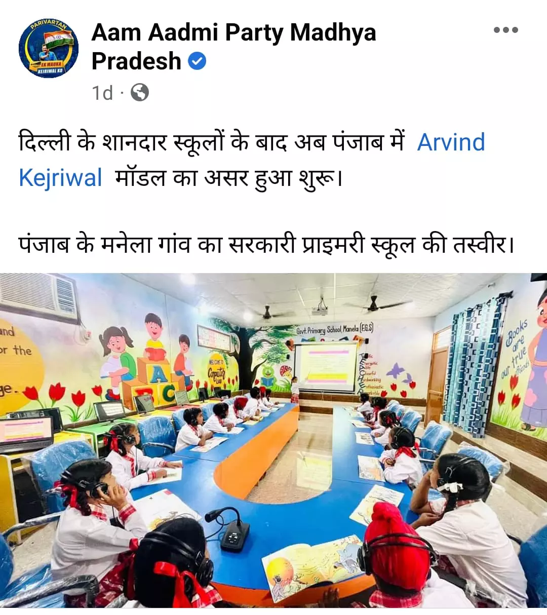 आम आदमी पार्टी महाराष्ट्र के आधिकारिक ट्विटर हैंडल ने तस्वीर पोस्ट करते हुए कैप्शन दिया, "दिल्ली के विश्व स्तरीय सरकारी स्कूलों की तर्ज पर अब पंजाब में भी @अरविंद केजरीवाल मॉडल सामने आया है. यह पंजाब के "मनेला" गांव का एक प्राथमिक सरकारी स्कूल है."