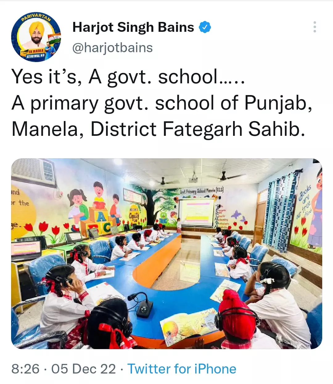 पंजाब के शिक्षा मंत्री हरजोत सिंह बैंस ने ट्विटर पर तस्वीर शेयर करते हुए लिखा, "हां, यह एक सरकारी स्कूल है. पंजाब के फ़तेहगढ़ ज़िले के मनेला का प्राइमरी स्कूल."