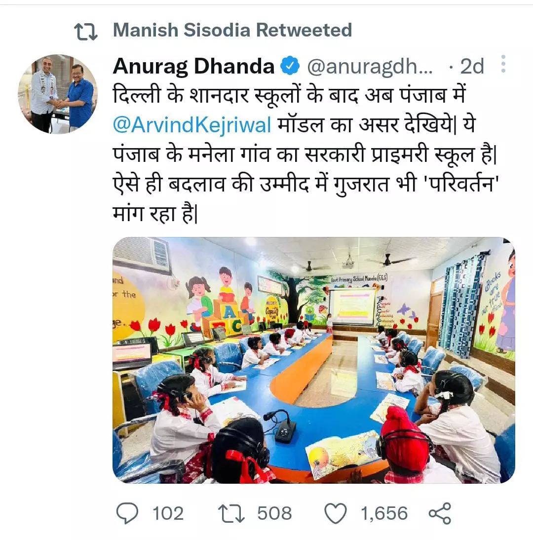 आम आदमी पार्टी नेता अनुराग ढांडा ने भी तस्वीर के साथ ट्वीट किया, "दिल्ली के शानदार स्कूलों के बाद अब पंजाब में @ArvindKejriwal मॉडल का असर देखिये. ये पंजाब के मनेला गांव का सरकारी प्राइमरी स्कूल है. ऐसे ही बदलाव की उम्मीद में गुजरात भी 'परिवर्तन' मांग रहा है."
