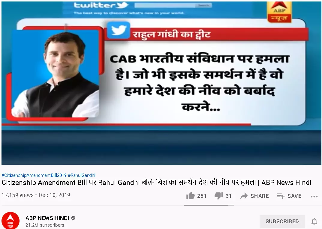 हमने गूगल पर भी कीवर्ड डालकर सर्च किया कि क्या राहुल गाँधी ने कभी कोई ऐसा ट्वीट किया हो. हमें ऐसा कोई भी ट्वीट नहीं मिला बल्कि राहुल गांधी का साल 2019 का वो ट्वीट मिला जिसमें उन्होंने लिखा था नागरिकता संशोधन विधेयक भारतीय संविधान पर हमला है.जो भी इसका समर्थन करेगा वो देश की नींव पर हमला करने जैसा होगा.