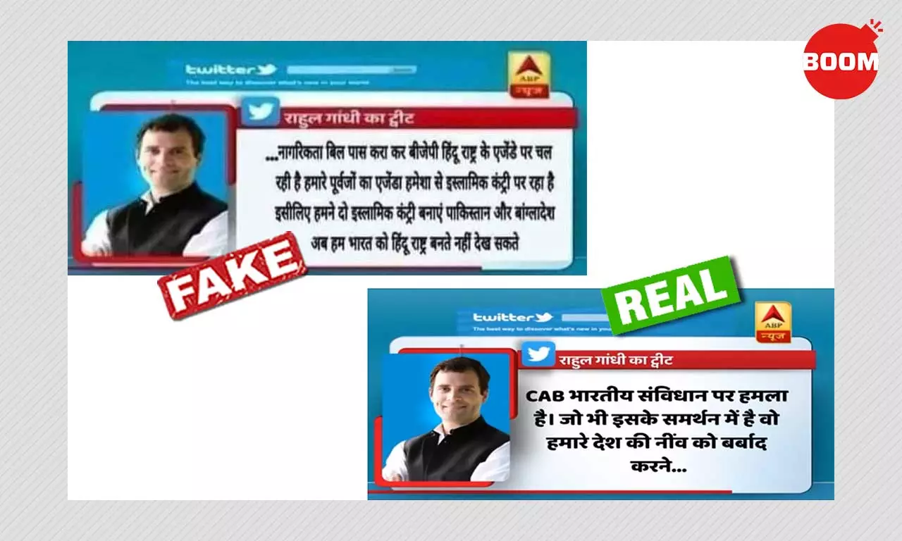 सोशल मीडिया पर एक ट्वीट का स्क्रीनशॉट वायरल है. इस फ़ोटो में ABP News का लोगो लगा हुआ है और साथ में कांग्रेस नेता राहुल गांधी के एक ट्वीट का स्क्रीनशॉट भी चस्पा है.