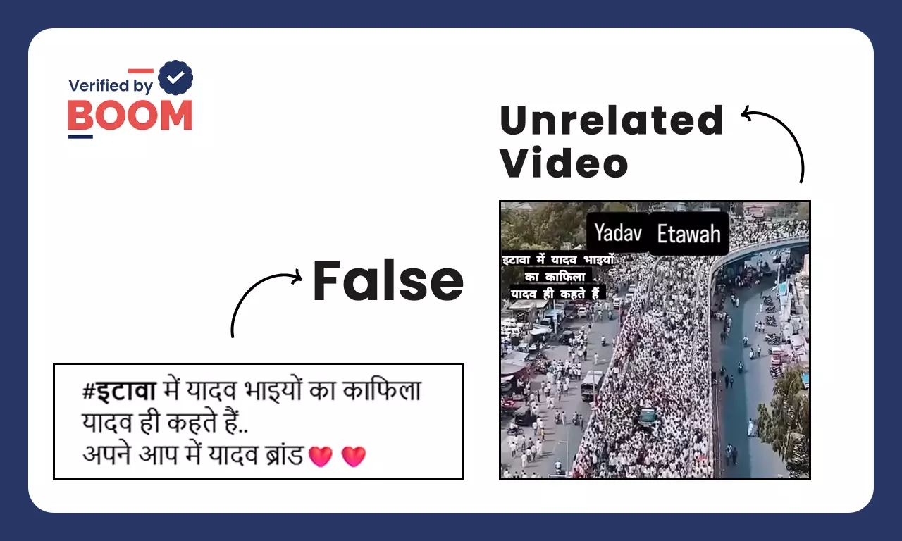 उत्तर प्रदेश के इटावा में यादव कथावाचकों के साथ जातीय हिंसा की घटना के बाद यादव समाज के प्रदर्शन के दावे से सोशल मीडिया पर असंबंधित वीडियो वायरल है. वायरल वीडियो में भारी संख्या में जनता के हुजूम को देखा जा सकता है. जनसमूह ने अपने हाथ में पीले रंग के झंडे ले रखे हैं. इस भीड़ के बीच में गाड़ियों के एक काफिले को भी देखा जा सकता है.