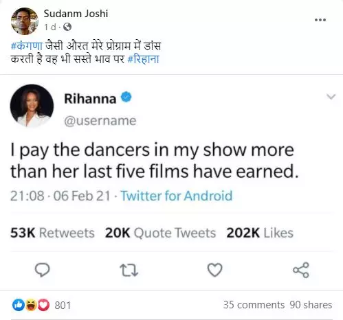 फ़ेसबुक पर ट्वीट का स्क्रीनशॉट शेयर करते हुए एक यूज़र ने लिखा, "#कंगणा जैसी औरत मेरे प्रोग्राम में डांस करती है वह भी सस्ते भाव पर #रिहाना."