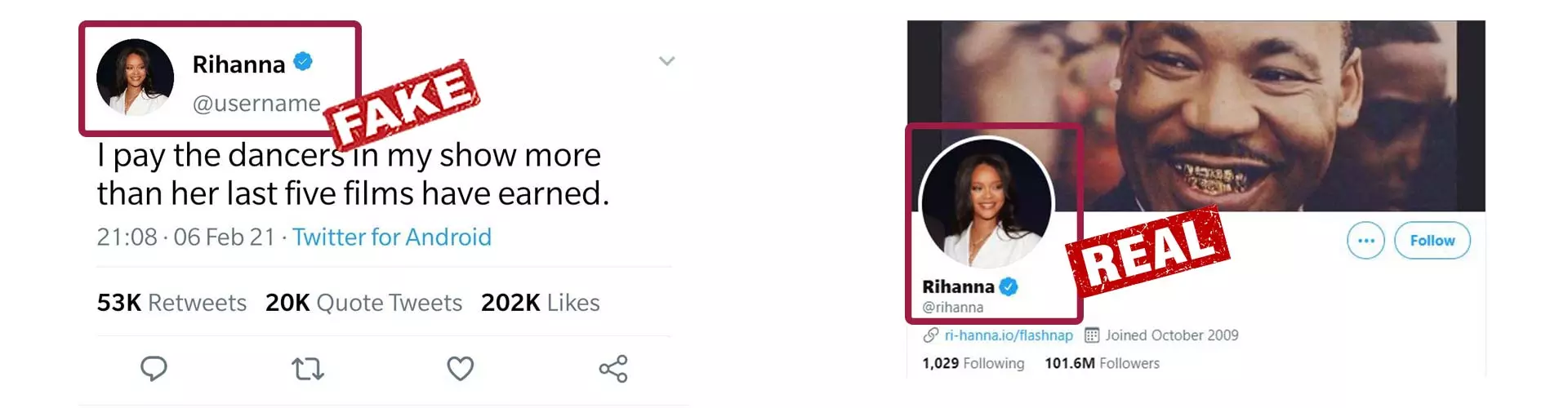 रिहाना के मूल ट्विटर हैंडल का यूज़रनेम @rihanna है, जबकि वायरल ट्वीट के यूज़रनेम में @username लिखा है. आमतौर पर ट्विटर यूज़र के यूज़रनेम में उसे अपनी पसंद के अनुसार नाम या नाम के साथ कोई अंक डालना होता है.