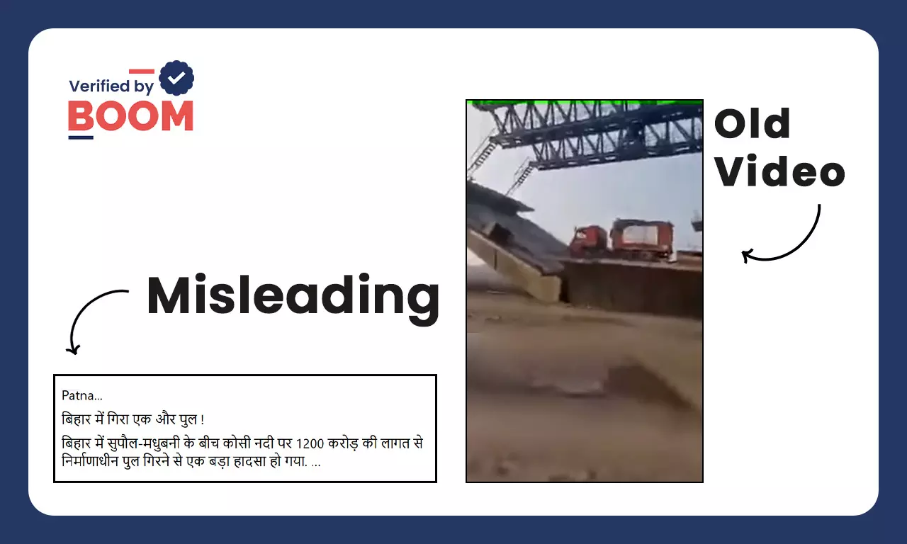बूम ने जांच में पाया कि वायरल वीडियो 22 मार्च 2024 को बिहार में सुपौल-मधुबनी जिलों के बीच कोसी नदी पर बन रहे पुल के स्लैब के गिरने की घटना का है. इस घटना में एक मजदूर की मौत हो गई थी वहीं कुछ घायल हुए थे.