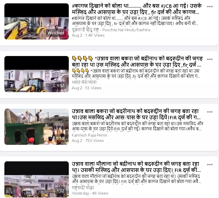फ़ेसबुक पर इस वीडियो को शेयर करते हुए कैप्शन दिया गया 'उन्नाव वाला बकरा जो बद्रीनाथ को बदरुदीन शाह की जगह बता रहा था उसके मस्जिद और आसपास के घर उड़ा दिए ,fir दर्ज की और कागज दिखाने को बोला गया अवैध बनी थी मस्जिद और घर। योगी जी वाह योगी जी..