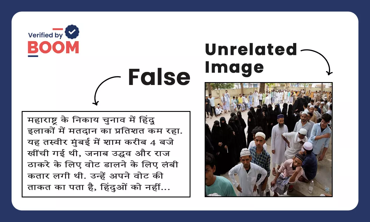 सोशल मीडिया पर एक तस्वीर वायरल है, जिसमें मुस्लिम समुदाय की महिलाएं और पुरुष लंबी कतारों में खड़े हैं. इस तस्वीर के साथ दावा किया जा रहा है कि महाराष्ट्र में निकाय चुनाव में उद्धव और राज ठाकरे को वोट देने के लिए मुसलमानों की लंबी लाइन लगी हुई थी और यह तस्वीर मुंबई में लगभग शाम 4 बजे खींची गई थी.