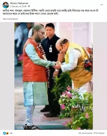 बांग्ला में शेयर किये गए पोस्ट में कैप्शन दिया गया है, "अमित शाह ने असदुद्दीन का हाथ पकड़कर विनती की और कहा 'जैसे बिहार दिया बंगाल भी हमें दे दो, जितनी भी ज़रूरत होगी मैं नकदी की पेशकश करूंगा।"