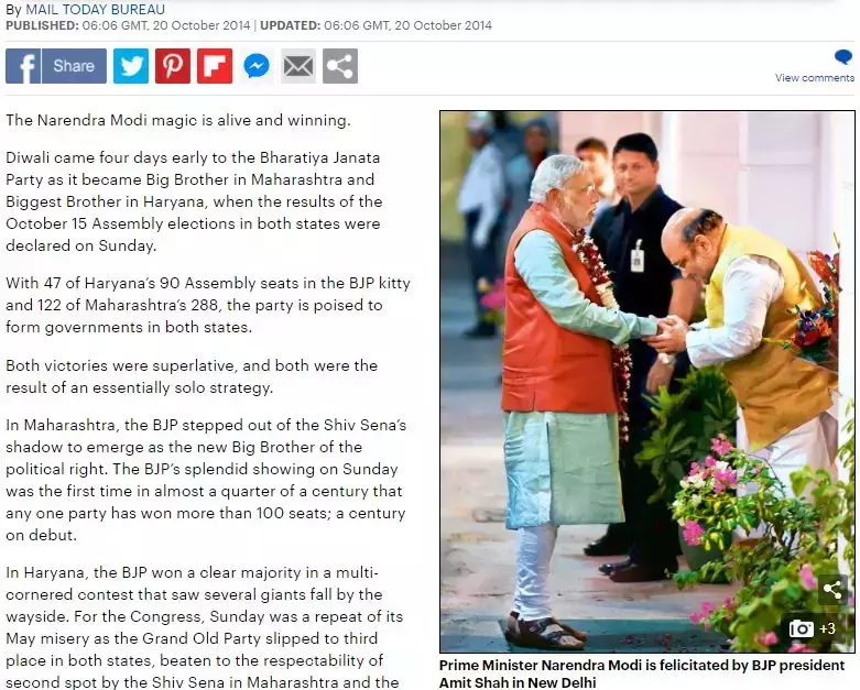 20 अक्टूबर, 2014 को डेली मेल द्वारा प्रकाशित मूल तस्वीर, नई दिल्ली में भाजपा अध्यक्ष अमित शाह द्वारा प्रधानमंत्री नरेंद्र मोदी को बधाई देने के बारे में बताती है। उस समय, पार्टी ने दो राज्यों, हरियाणा और महाराष्ट्र के विधानसभा चुनाव जीते थे।