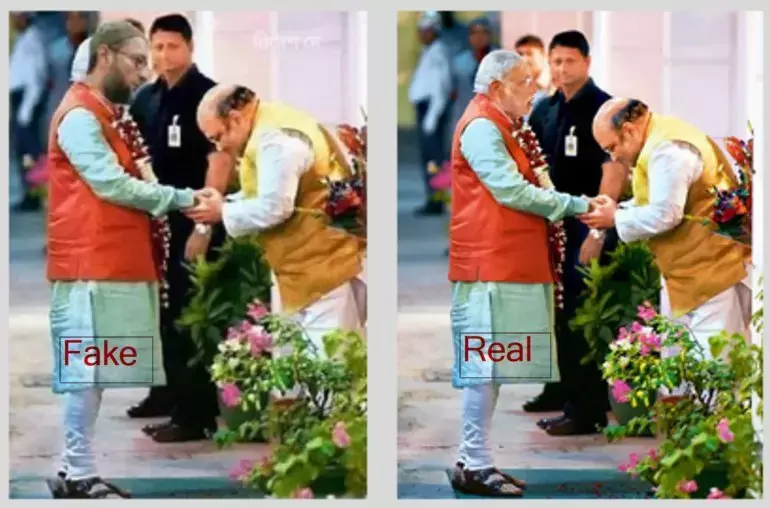 मूल तस्वीर और एडिटेड तस्वीर की तुलना नीचे देखी जा सकती है। प्रधानमंत्री के सिर को बदल दिया गया है और ओवैसी की तस्वीर फोटोशॉप्ट करके लगा दी गई है, जबकि पोशाक वही है।