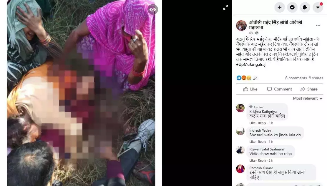 फ़ेसबुक पर तस्वीर शेयर करते हुए एक यूज़र ने कैप्शन में लिखा, "बदायूं गैंगरेप-मर्डर केस, मंदिर गई 50 वर्षीय महिला को गैंगरेप के बाद मर्डर कर दिया गया। गैंगरेप के दौरान जो भयावहता की गई शायद राक्षस भी कांप जाता। लेकिन महंत और उसके चेले दानव निकले। बदायूं पुलिस 2 दिन तक मामला छिपाए रही। ये हैवानियत की पराकाष्ठा है #UpMeJangalraj