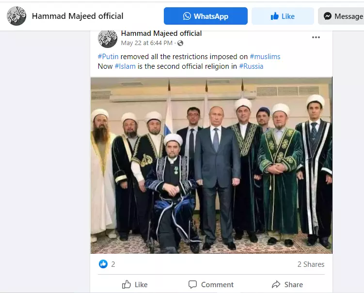 फ़ेसबुक पर एक यूज़र Hammad Majeed official ने तस्वीर पोस्ट करते हुए लिखा 'पुतिन ने मुसलमानों पर लगे सारे प्रतिबंध हटा दिए है और इस्लाम को रूस का दूसरा आधिकारिक धर्म घोषित कर दिया'.