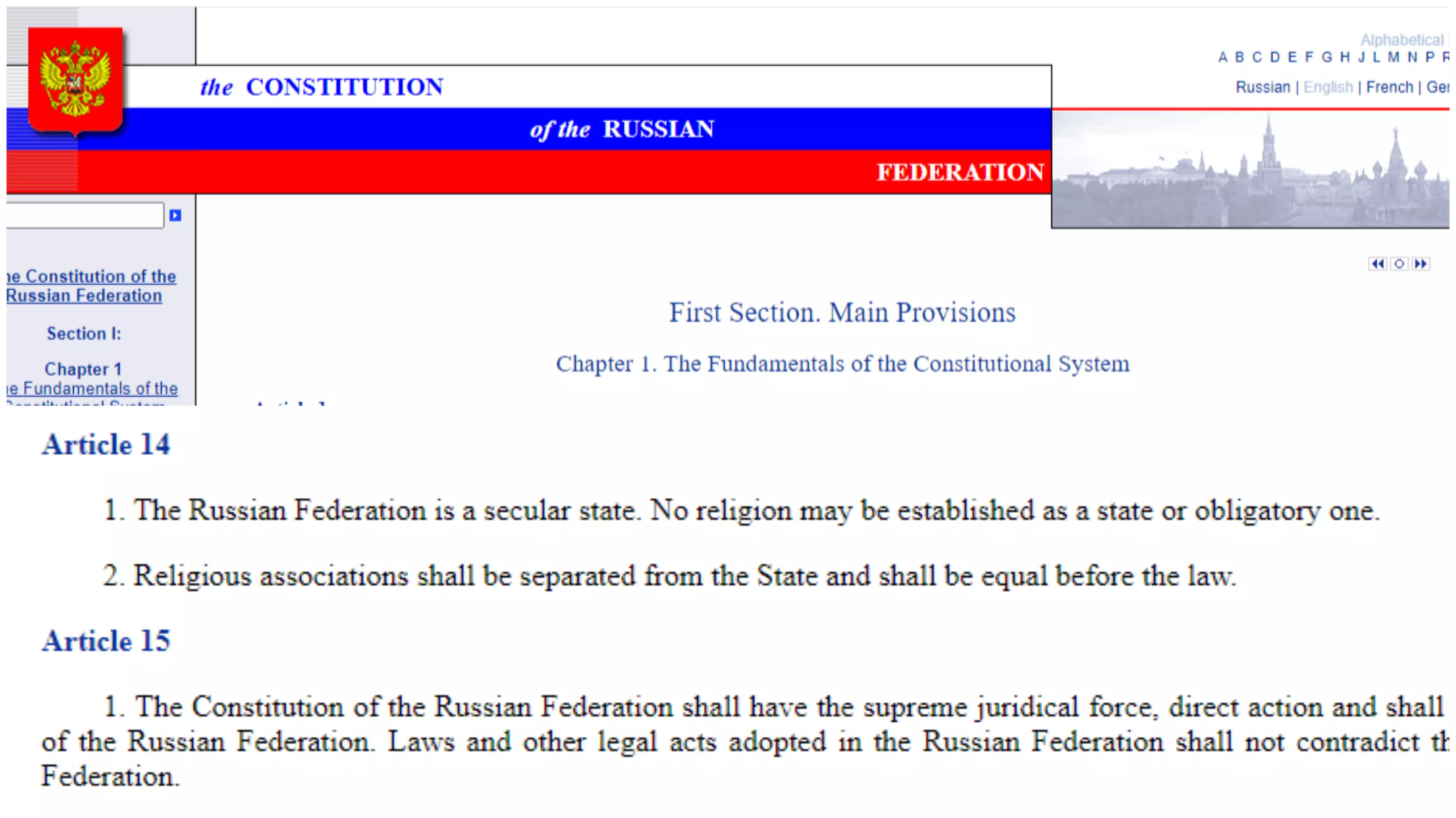 हमने रूस के संविधान को देखा जिसके आर्टिकल 14 में लिखा है, "रूसी संघ एक धर्मनिरपेक्ष राज्य है. किसी भी धर्म को राज्य या अनिवार्य के रूप में स्थापित नहीं किया जा सकता है."