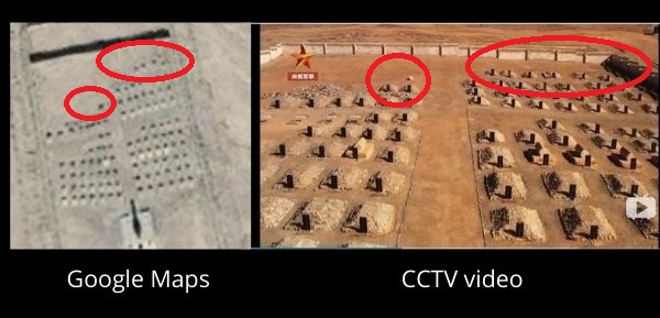 गूगल अर्थ की फरवरी 2011 की तस्वीर में बायीं तरफ़ लाल निशान में एक कब्र देखी जा सकती है जबकि सीसीटीवी चैनल की अगस्त 2020 की वीडियो में 2 क़ब्र बढ़ जाती हैं। गूगल अर्थ इमेज के दायीं तरफ़ दिखने वाली 4 क़ब्रें अगस्त की वीडियो में 6 हो जाती हैं। इस तरह 3 कब्रों के बढ़ने से गूगल अर्थ इमेज में दिखने वाली 105 क़ब्रों की संख्या 108 हो जाती है।