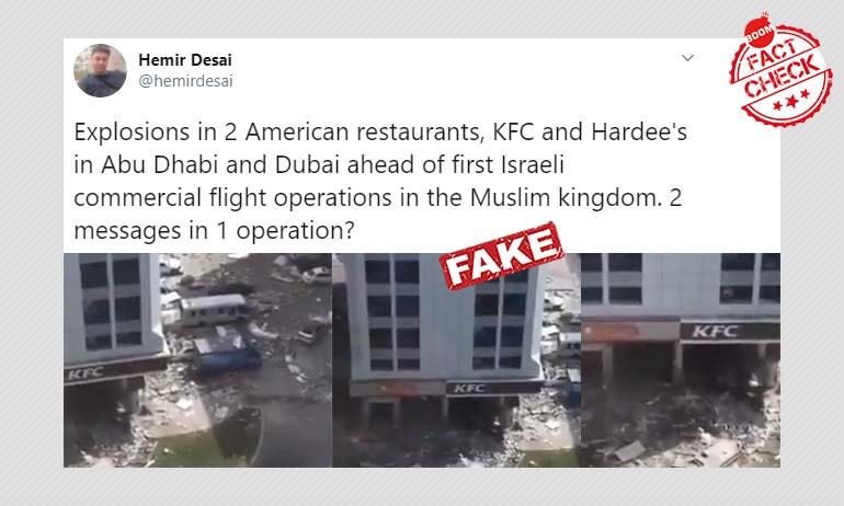 वीडियो को अंग्रेजी कैप्शन के साथ शेयर किया जा रहा है, जिसका हिंदी अनुवाद यूं है: "मुस्लिम देश में पहले इज़राइली कमर्शियल उड़ान संचालन के बाद अबू धाबी, दुबई, में 2 अमेरिकी रेस्तरां, केएफसी और हार्डी में विस्फोट। 1 ऑपरेशन में 2 संदेश?"
