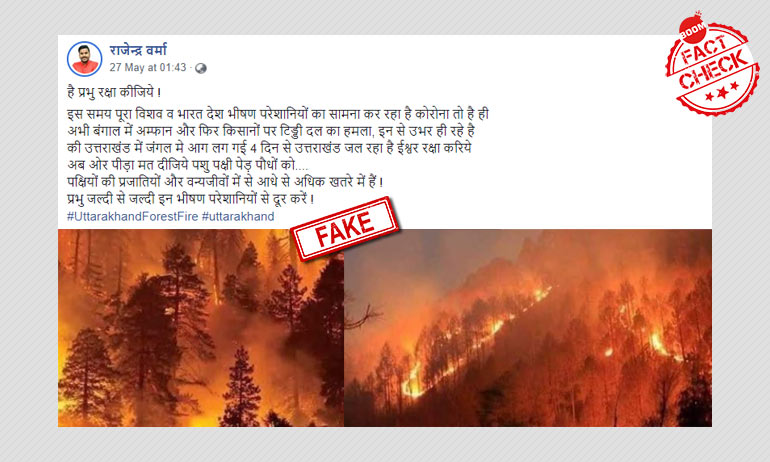 बूम को ऐसा ही एक पोस्ट मिला जिसमे दो तस्वीरों के एक सेट के साथ कैप्शन है: है प्रभु रक्षा कीजिये ! इस समय पूरा विशव व भारत देश भीषण परेशानियों का सामना कर रहा है कोरोना तो है ही अभी बंगाल में अम्फान और फिर किसानों पर टिड्डी दल का हमला, इन से उभर ही रहे है की उत्तराखंड में जंगल मे आग लग गई 4 दिन से उत्तराखंड जल रहा है ईश्वर रक्षा करिये अब ओर पीड़ा मत दीजिये पशु पक्षी पेड़ पौधों को....पक्षियों की प्रजातियों और वन्यजीवों में से आधे से अधिक खतरे में हैं ! प्रभु जल्दी से जल्दी इन भीषण परेशानियों से दूर करें !