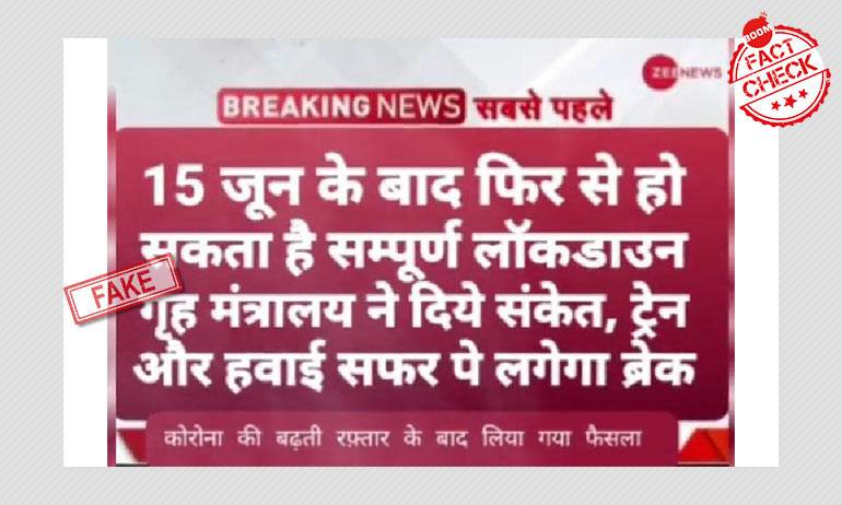 वायरल ग्राफ़िक के ब्रेकिंग न्यूज़ टिकर पर लिखा है "15 जून के बाद फिर से हो सकता है सम्पूर्ण लॉकडाउन गृह मंत्रालय ने दिये संकेत , ट्रेन और हवाई सफर पे लगेगा ब्रेक कोरोना की बढ़ती रफ्तार के बाद लिया गया फैसला।"