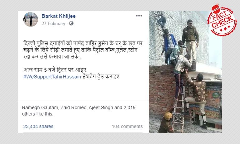 वायरल हो रही तस्वीर को भ्रामक कैप्शन के साथ शेयर किया जा रहा है, जिसमें कहा गया है कि "दिल्ली पुलिस दंगाईयों को पार्षद ताहिर हुसेन के घर के छत पर चढ़ने के लिये सीढ़ी लगाते हुए ताकि पैट्रोल बॉम्ब,गुलेल,स्टोन रख कर उसे फंसाया जा सके" (Sic)