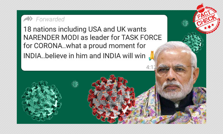 एक वायरल मैसेज, जिसमें दावा किया गया है कि पीएम मोदी यु.एस और यु.के सहित कई देशों के कोरोनावायरस टास्क फोर्स का नेतृत्व करेंगे, ग़लत है।