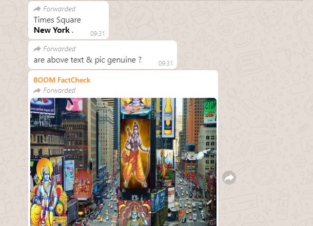 बूम ने रिवर्स इमेज सर्च किया पर ऐसी कोई रिपोर्ट नहीं मिली जहाँ टाइम्स स्क्वायर पर पिछले दिनों भगवान राम की तस्वीरों के डिस्प्ले होने की बात कही गयी हो |